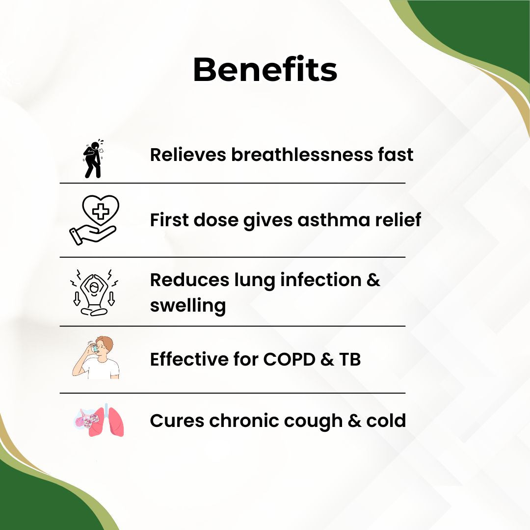 Asthmahar is a natural Ayurvedic formulation designed to help manage asthma, bronchitis, allergic cough, breathing difficulties, COPD, chest congestion, and nasal allergies. It supports healthy lung function and improves overall respiratory health.