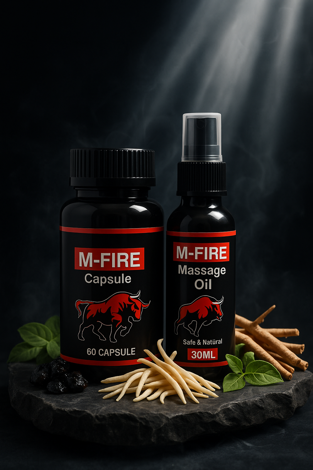 The combo pack contains M-Fire Men Wellness Capsules for internal stamina and vitality, along with M-Fire Oil for external use to make your jouney joyful.